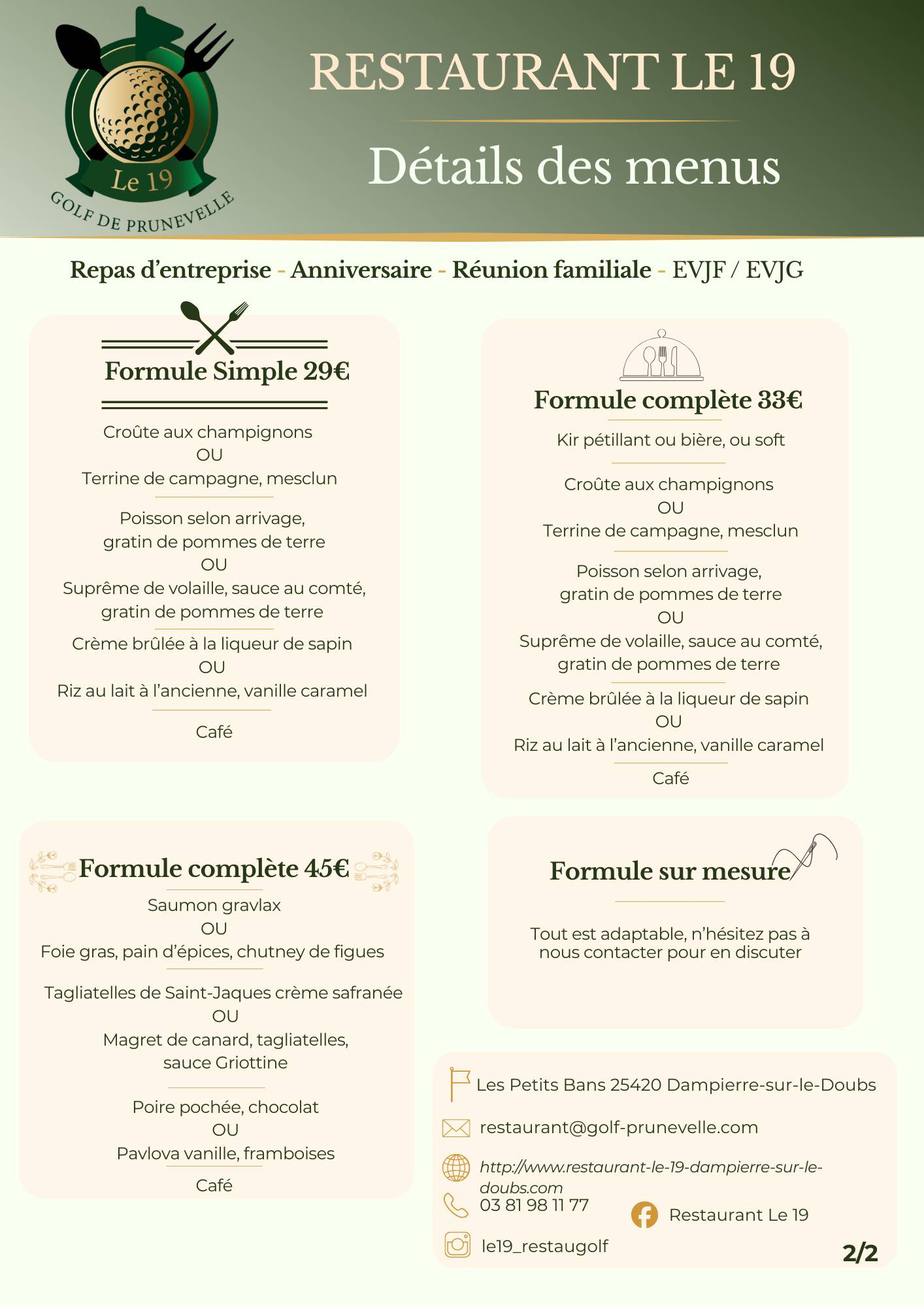 À proximité de Voujeaucourt, le restaurant Le 19 met à disposition ses espaces pour vos repas de groupe, séminaires ou événements privés. Avec sa grande salle équipée et son parking privé, l’établissement s’adapte à toutes les configurations : petit-déjeuner professionnel, repas d’entreprise, apéritif dînatoire ou grande tablée entre amis. William et Loïs personnalisent chaque demande pour offrir un moment sur mesure, toujours dans un cadre unique : celui du golf de Prunevelle, entouré de nature et de sérénité.